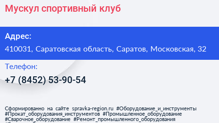 Мускул, спортивный клуб по адресу 410031, Саратовская область, Саратов, Московская, 32 в дальнейшем Организация, размещена в следующих категориях: