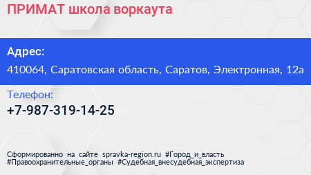 ПРИМАТ, школа воркаута по адресу 410064, Саратовская область, Саратов, Электронная, 12а в дальнейшем Организация, размещена в следующих категориях: