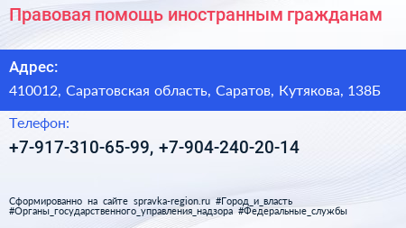 Правовая помощь иностранным гражданам по адресу 410012, Саратовская область, Саратов, Кутякова, 138Б в дальнейшем Организация, размещена в следующих категориях: