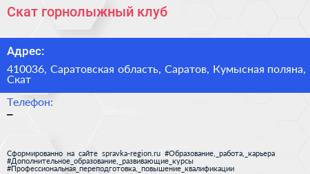 Скат, горнолыжный клуб по адресу 410036, Саратовская область, Саратов, Кумысная поляна, Скат в дальнейшем Организация, размещена в следующих категориях: