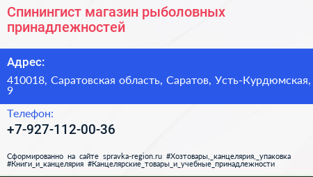 Спинингист, магазин рыболовных принадлежностей по адресу 410018, Саратовская область, Саратов, Усть-Курдюмская, 9 в дальнейшем Организация, размещена в следующих категориях: