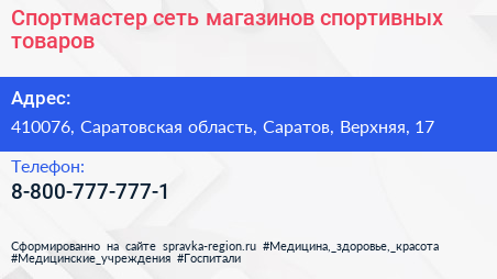 Спортмастер, сеть магазинов спортивных товаров по адресу 410076, Саратовская область, Саратов, Верхняя, 17 в дальнейшем Организация, размещена в следующих категориях: