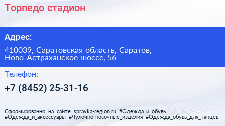 Торпедо, стадион по адресу 410039, Саратовская область, Саратов, Ново-Астраханское шоссе, 56 в дальнейшем Организация, размещена в следующих категориях: