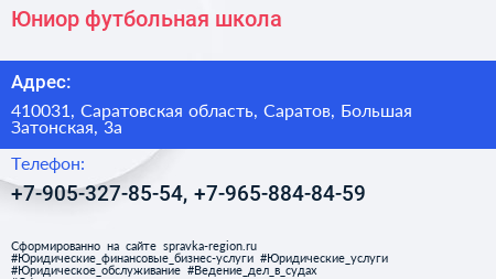 Юниор, футбольная школа по адресу 410031, Саратовская область, Саратов, Большая Затонская, 3а в дальнейшем Организация, размещена в следующих категориях: