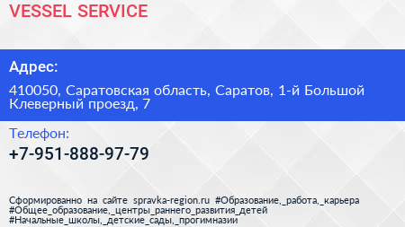 VESSEL SERVICE по адресу 410050, Саратовская область, Саратов, 1-й Большой Клеверный проезд, 7 в дальнейшем Организация, размещена в следующих категориях: