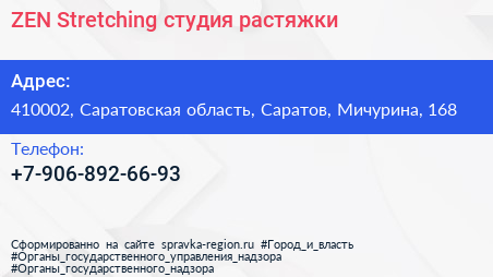 ZEN Stretching, студия растяжки по адресу 410002, Саратовская область, Саратов, Мичурина, 168 в дальнейшем Организация, размещена в следующих категориях: