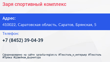 Заря, спортивный комплекс по адресу 410022, Саратовская область, Саратов, Брянская, 5 в дальнейшем Организация, размещена в следующих категориях:
