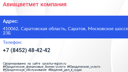 Авиацветмет, компания по адресу 410062, Саратовская область, Саратов, Московское шоссе, 23Б в дальнейшем Организация, размещена в следующих категориях: