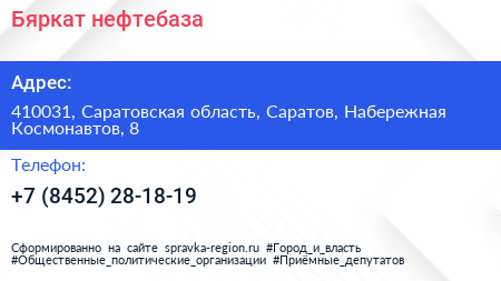 Бяркат, нефтебаза по адресу 410031, Саратовская область, Саратов, Набережная Космонавтов, 8 в дальнейшем Организация, размещена в следующих категориях: