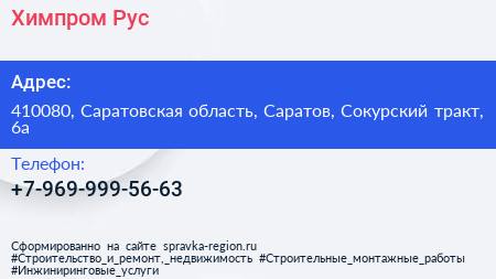 Химпром-Рус по адресу 410080, Саратовская область, Саратов, Сокурский тракт, 6а в дальнейшем Организация, размещена в следующих категориях: