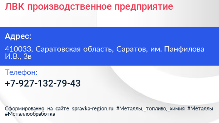 ЛВК, производственное предприятие по адресу 410033, Саратовская область, Саратов, им. Панфилова И.В., 3в в дальнейшем Организация, размещена в следующих категориях: