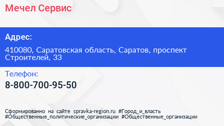 Мечел-Сервис по адресу 410080, Саратовская область, Саратов, проспект Строителей, 33 в дальнейшем Организация, размещена в следующих категориях: