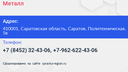 Металл+ по адресу 410001, Саратовская область, Саратов, Политехническая, 5в в дальнейшем Организация, размещена в следующих категориях: