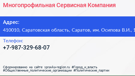 Многопрофильная Сервисная Компания по адресу 410010, Саратовская область, Саратов, им. Осипова В.И., 1 в дальнейшем Организация, размещена в следующих категориях:
