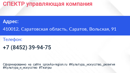 СПЕКТР, управляющая компания по адресу 410012, Саратовская область, Саратов, Вольская, 91 в дальнейшем Организация, размещена в следующих категориях: