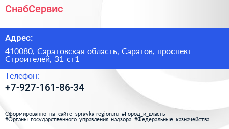 СнабСервис по адресу 410080, Саратовская область, Саратов, проспект Строителей, 31 ст1 в дальнейшем Организация, размещена в следующих категориях: