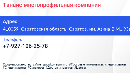 Танаис, многопрофильная компания по адресу 410059, Саратовская область, Саратов, им. Азина В.М., 93а в дальнейшем Организация, размещена в следующих категориях: