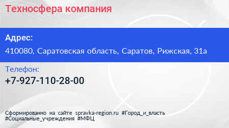 Техносфера, компания по адресу 410080, Саратовская область, Саратов, Рижская, 31а в дальнейшем Организация, размещена в следующих категориях: