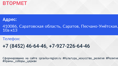 ВТОРМЕТ по адресу 410086, Саратовская область, Саратов, Песчано-Умётская, 10а к13 в дальнейшем Организация, размещена в следующих категориях: