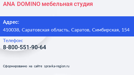 ANA DOMINO, мебельная студия по адресу 410038, Саратовская область, Саратов, Симбирская, 154 в дальнейшем Организация, размещена в следующих категориях: