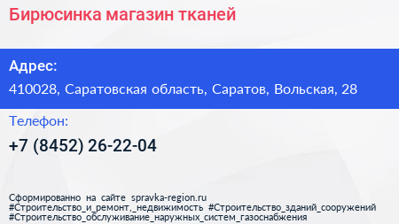 Бирюсинка, магазин тканей по адресу 410028, Саратовская область, Саратов, Вольская, 28 в дальнейшем Организация, размещена в следующих категориях:
