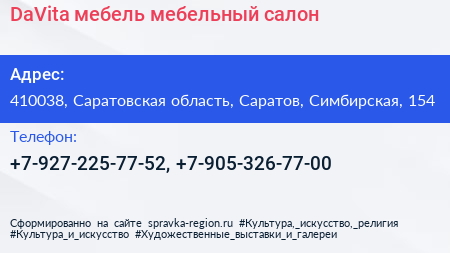 DaVita-мебель, мебельный салон по адресу 410038, Саратовская область, Саратов, Симбирская, 154 в дальнейшем Организация, размещена в следующих категориях: