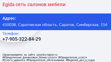 Egida, сеть салонов мебели по адресу 410038, Саратовская область, Саратов, Симбирская, 154 в дальнейшем Организация, размещена в следующих категориях: