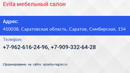 Evita, мебельный салон по адресу 410038, Саратовская область, Саратов, Симбирская, 154 в дальнейшем Организация, размещена в следующих категориях: