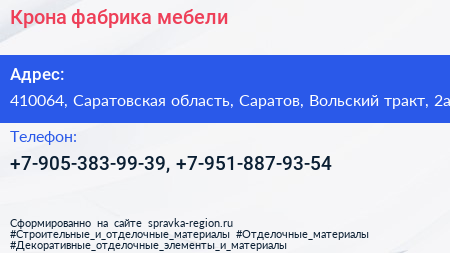 Крона, фабрика мебели по адресу 410064, Саратовская область, Саратов, Вольский тракт, 2а в дальнейшем Организация, размещена в следующих категориях: