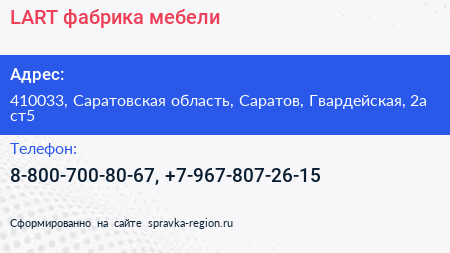 LART, фабрика мебели по адресу 410033, Саратовская область, Саратов, Гвардейская, 2а ст5 в дальнейшем Организация, размещена в следующих категориях: