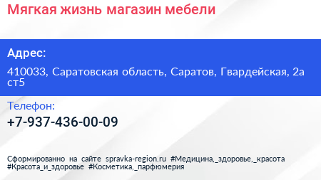 Мягкая жизнь, магазин мебели по адресу 410033, Саратовская область, Саратов, Гвардейская, 2а ст5 в дальнейшем Организация, размещена в следующих категориях: