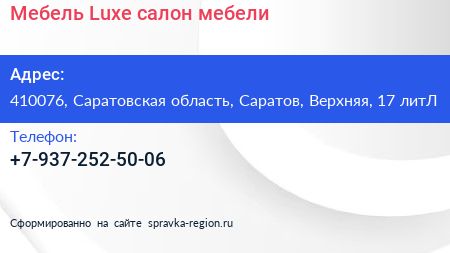 Мебель Luxe, салон мебели по адресу 410076, Саратовская область, Саратов, Верхняя, 17 литЛ в дальнейшем Организация, размещена в следующих категориях: