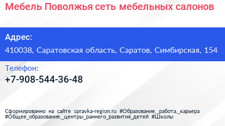 Мебель Поволжья, сеть мебельных салонов по адресу 410038, Саратовская область, Саратов, Симбирская, 154 в дальнейшем Организация, размещена в следующих категориях: