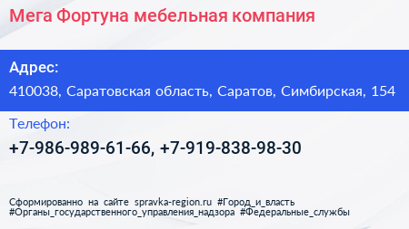 Мега Фортуна, мебельная компания по адресу 410038, Саратовская область, Саратов, Симбирская, 154 в дальнейшем Организация, размещена в следующих категориях: