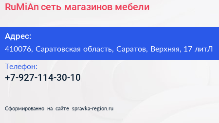 RuMiAn, сеть магазинов мебели по адресу 410076, Саратовская область, Саратов, Верхняя, 17 литЛ в дальнейшем Организация, размещена в следующих категориях: