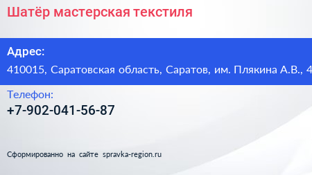 Шатёр, мастерская текстиля по адресу 410015, Саратовская область, Саратов, им. Плякина А.В., 4 в дальнейшем Организация, размещена в следующих категориях: