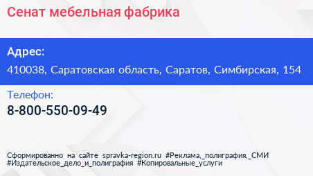 Сенат, мебельная фабрика по адресу 410038, Саратовская область, Саратов, Симбирская, 154 в дальнейшем Организация, размещена в следующих категориях: