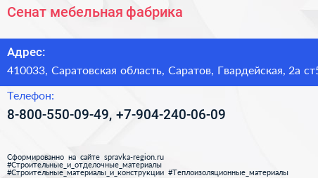 Сенат, мебельная фабрика по адресу 410033, Саратовская область, Саратов, Гвардейская, 2а ст5 в дальнейшем Организация, размещена в следующих категориях: