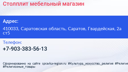 Столплит, мебельный магазин по адресу 410033, Саратовская область, Саратов, Гвардейская, 2а ст5 в дальнейшем Организация, размещена в следующих категориях: