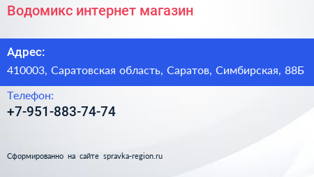 Водомикс, интернет-магазин по адресу 410003, Саратовская область, Саратов, Симбирская, 88Б в дальнейшем Организация, размещена в следующих категориях: