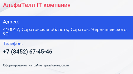 АльфаТелл, IT-компания по адресу 410017, Саратовская область, Саратов, Чернышевского, 90 в дальнейшем Организация, размещена в следующих категориях: