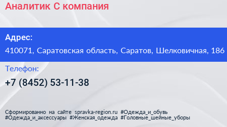 Аналитик-С, компания по адресу 410071, Саратовская область, Саратов, Шелковичная, 186 в дальнейшем Организация, размещена в следующих категориях: