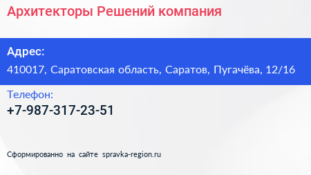 Архитекторы Решений, компания по адресу 410017, Саратовская область, Саратов, Пугачёва, 12/16 в дальнейшем Организация, размещена в следующих категориях: