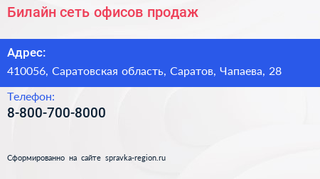 Билайн, сеть офисов продаж по адресу 410056, Саратовская область, Саратов, Чапаева, 28 в дальнейшем Организация, размещена в следующих категориях: