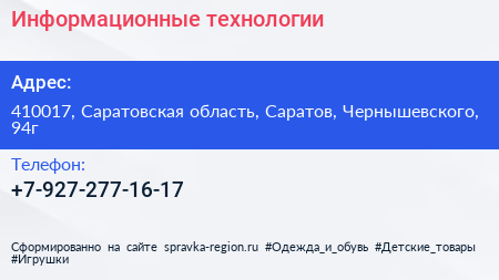 Информационные технологии по адресу 410017, Саратовская область, Саратов, Чернышевского, 94г в дальнейшем Организация, размещена в следующих категориях: