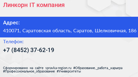 Линкорн, IT-компания по адресу 410071, Саратовская область, Саратов, Шелковичная, 186 в дальнейшем Организация, размещена в следующих категориях: