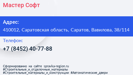 Мастер Софт по адресу 410012, Саратовская область, Саратов, Вавилова, 38/114 в дальнейшем Организация, размещена в следующих категориях:
