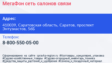 МегаФон, сеть салонов связи по адресу 410039, Саратовская область, Саратов, проспект Энтузиастов, 56Б в дальнейшем Организация, размещена в следующих категориях: