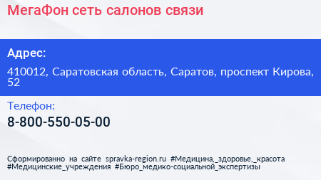 МегаФон, сеть салонов связи по адресу 410012, Саратовская область, Саратов, проспект Кирова, 52 в дальнейшем Организация, размещена в следующих категориях: