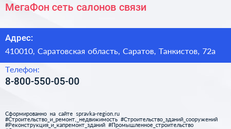 МегаФон, сеть салонов связи по адресу 410010, Саратовская область, Саратов, Танкистов, 72а в дальнейшем Организация, размещена в следующих категориях: